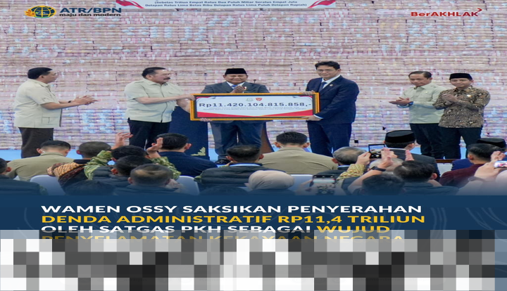 Dalam acara tersebut, Wamen Ossy menyampaikan, “Mewakili Bapak Menteri Nusron, saya hadir pada penyerahan denda administratif yang dilakukan oleh Satgas PKH dengan total mencapai sekitar Rp11,42 triliun. Ini adalah sebuah pencapaian yang patut disyukuri dan menjadi bagian dari upaya kita untuk memenuhi harapan Presiden serta masyarakat, agar kekayaan negara dan sumber daya alam yang kita miliki dapat dimanfaatkan semaksimal mungkin untuk kesejahteraan rakyat.”